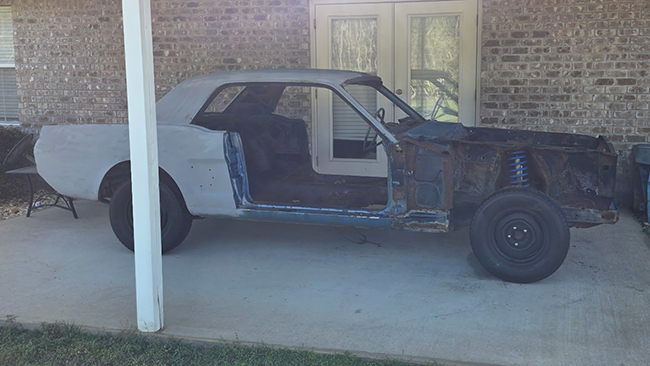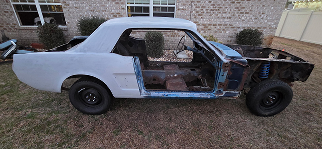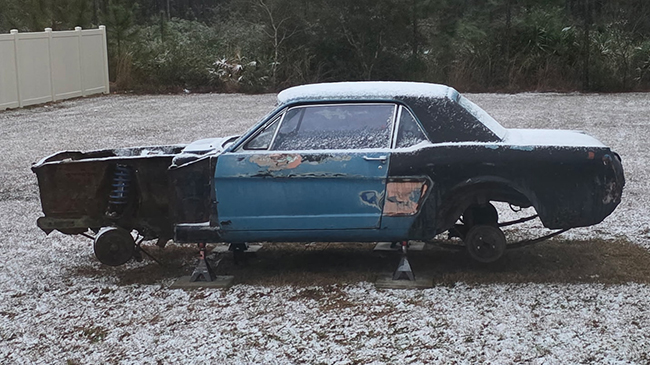 Mustang now has wheels, and a partial light temporary coat of please stop rusting..
